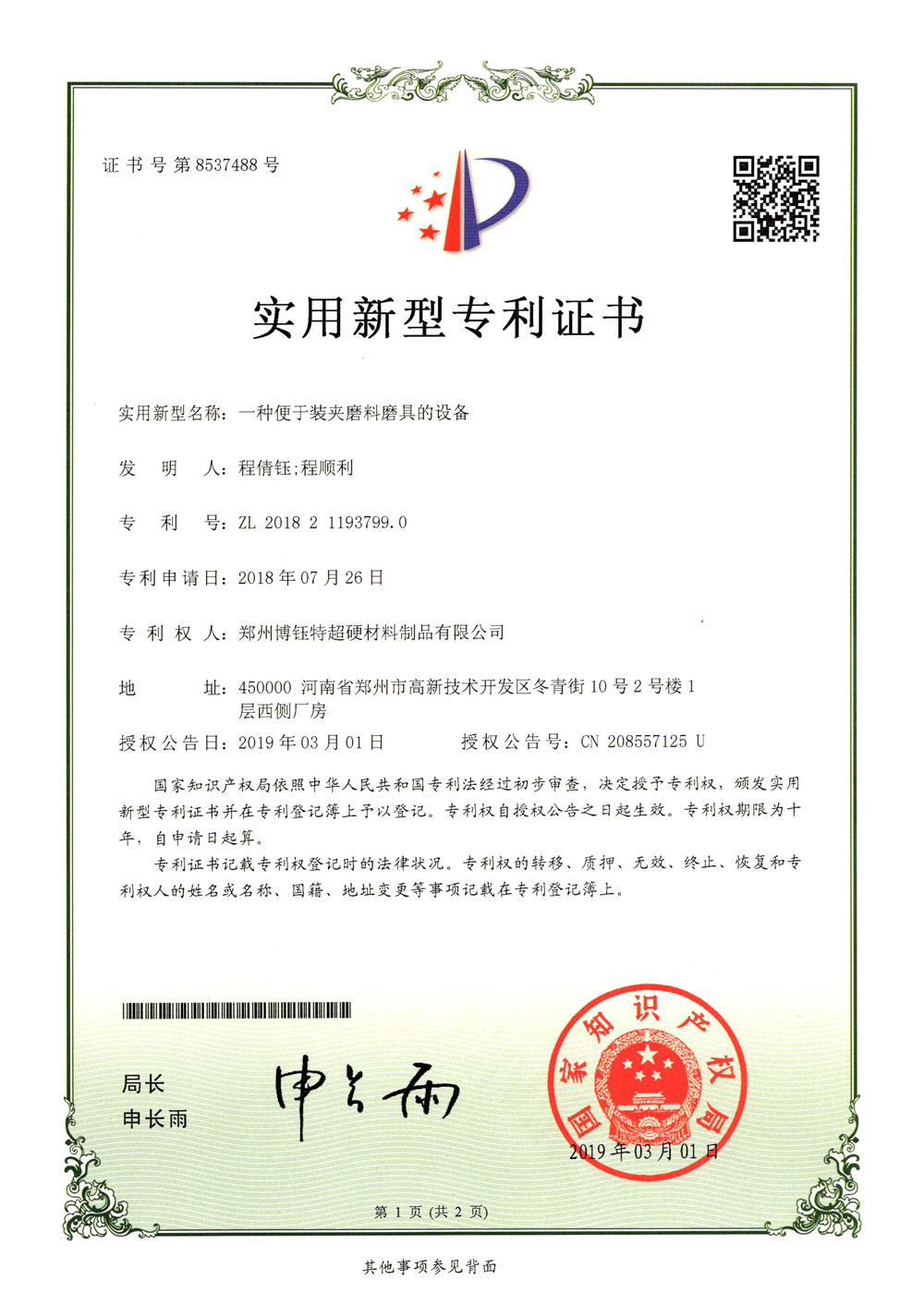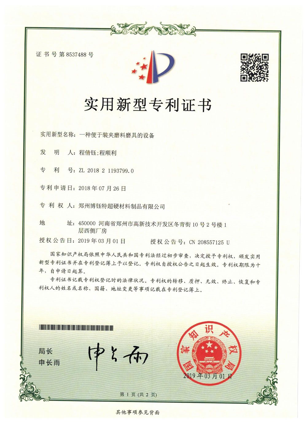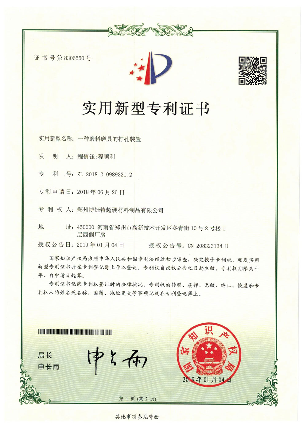 鄭州博鈺特超硬材料制品有限公司專利