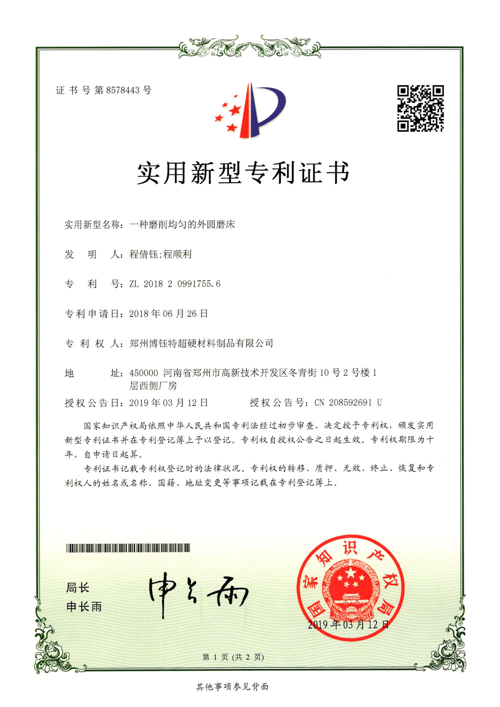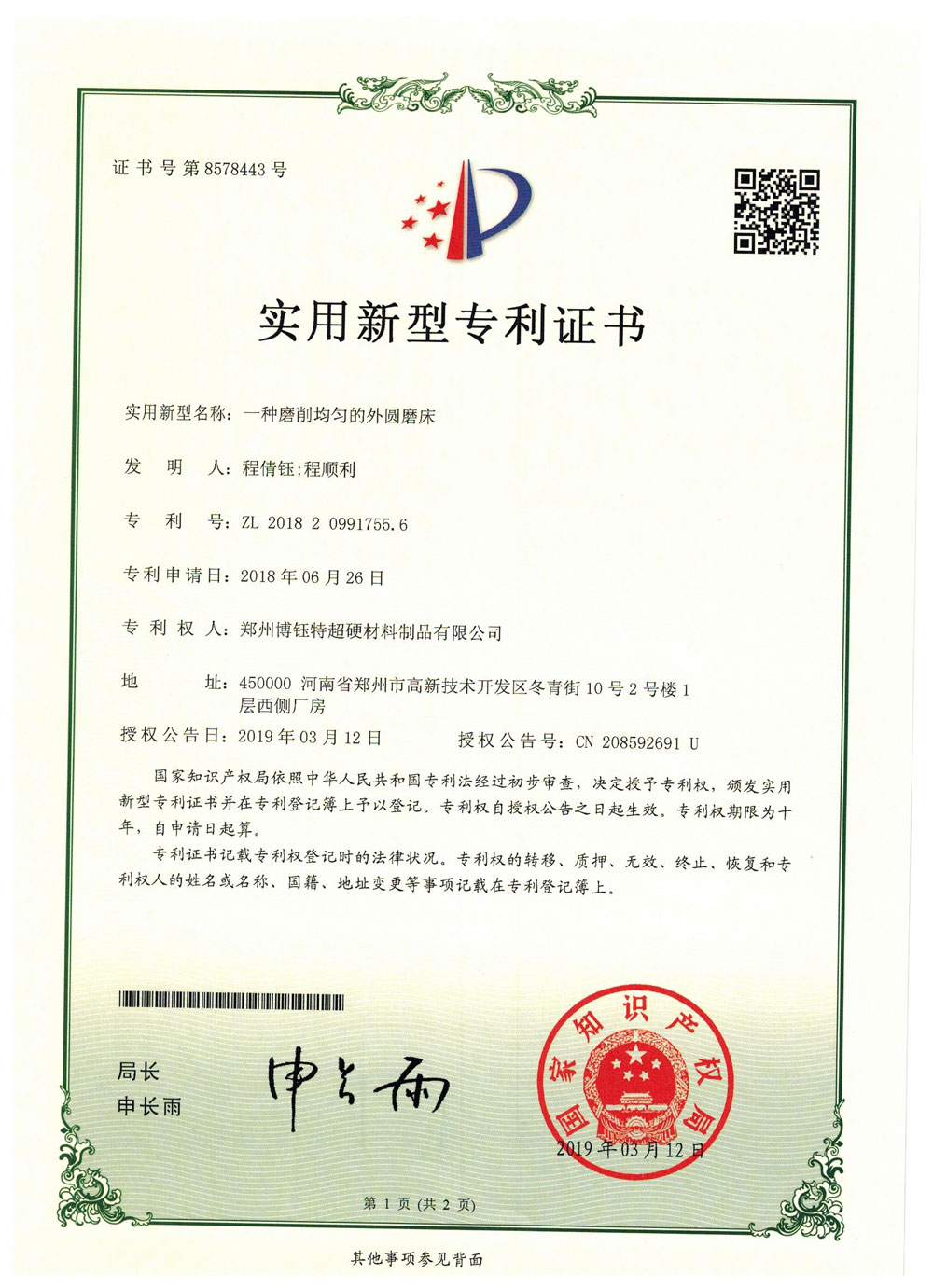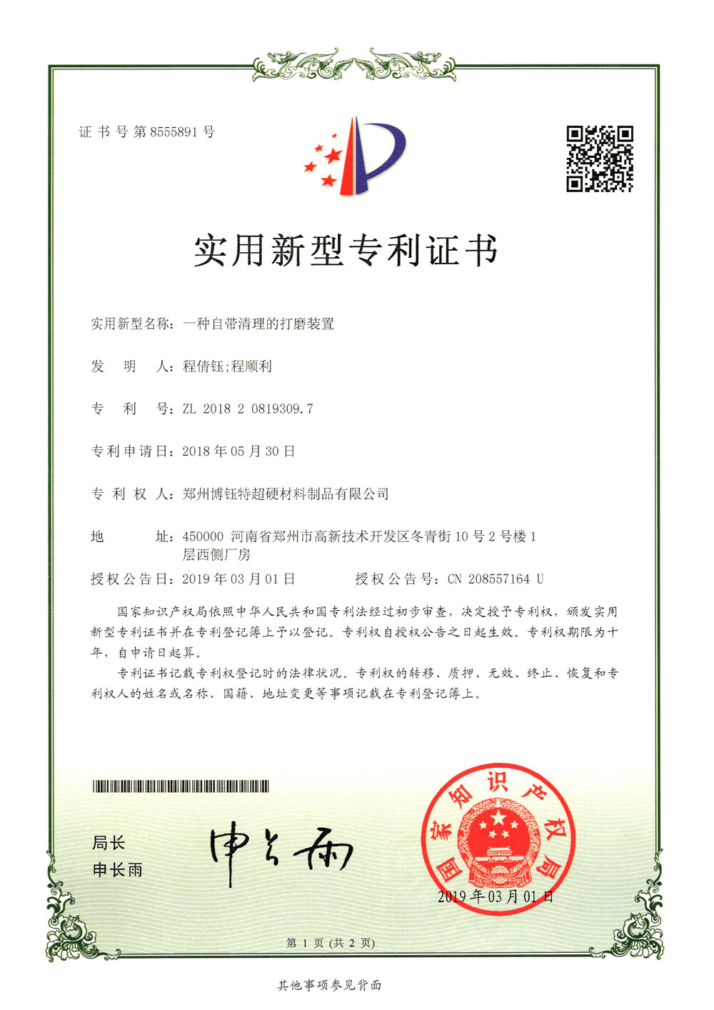 鄭州博鈺特超硬材料制品有限公司專利